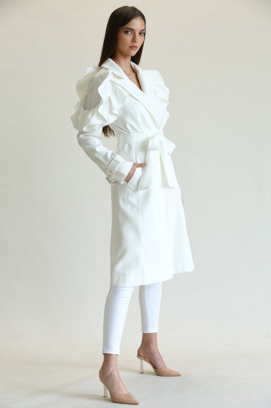 Eloise Ruffled Shoulders Long Coat- Ivory/ White