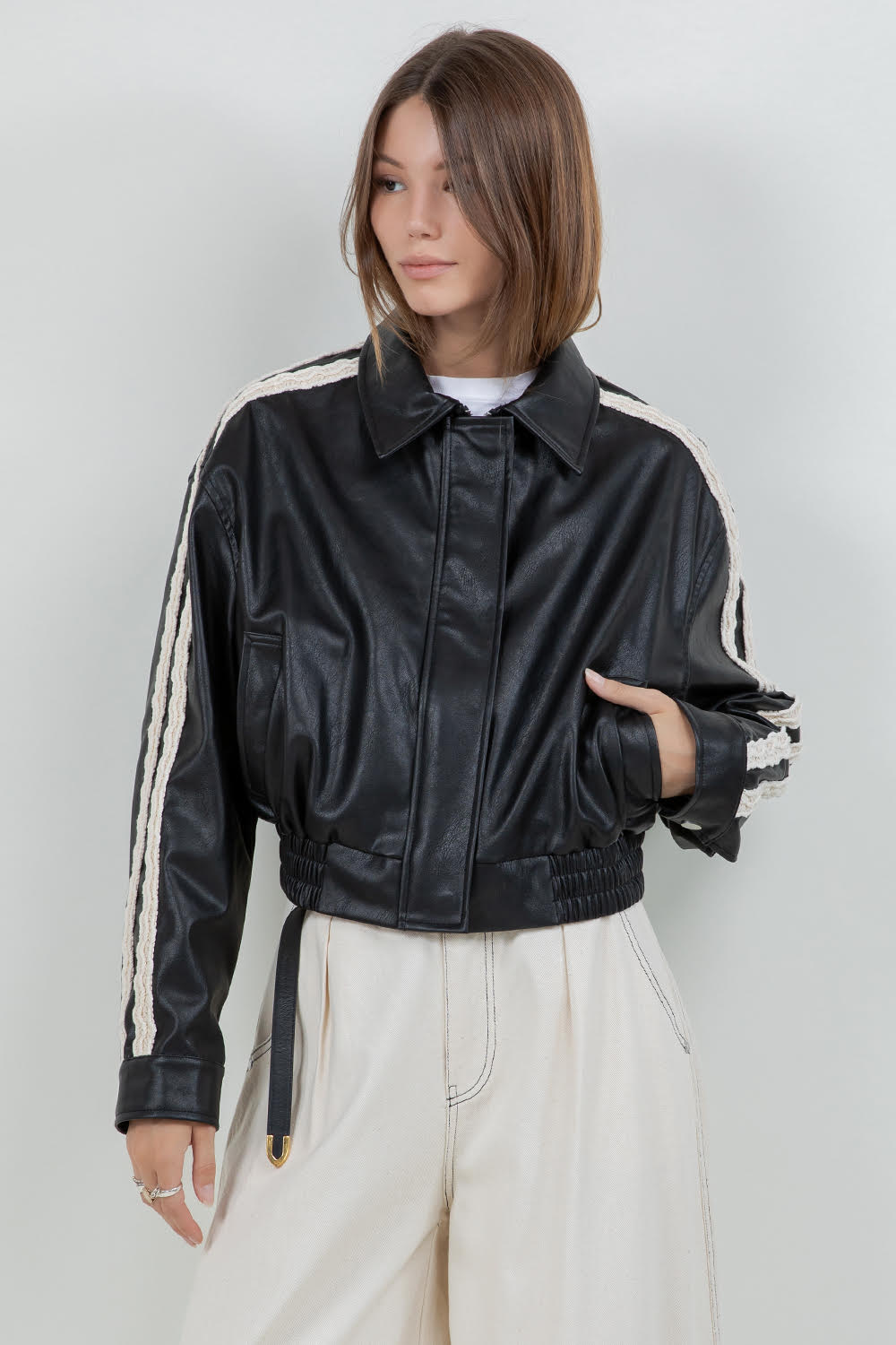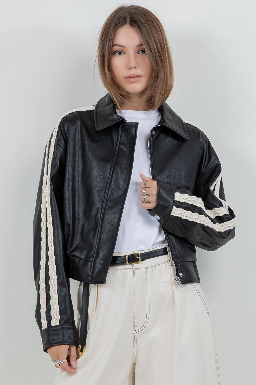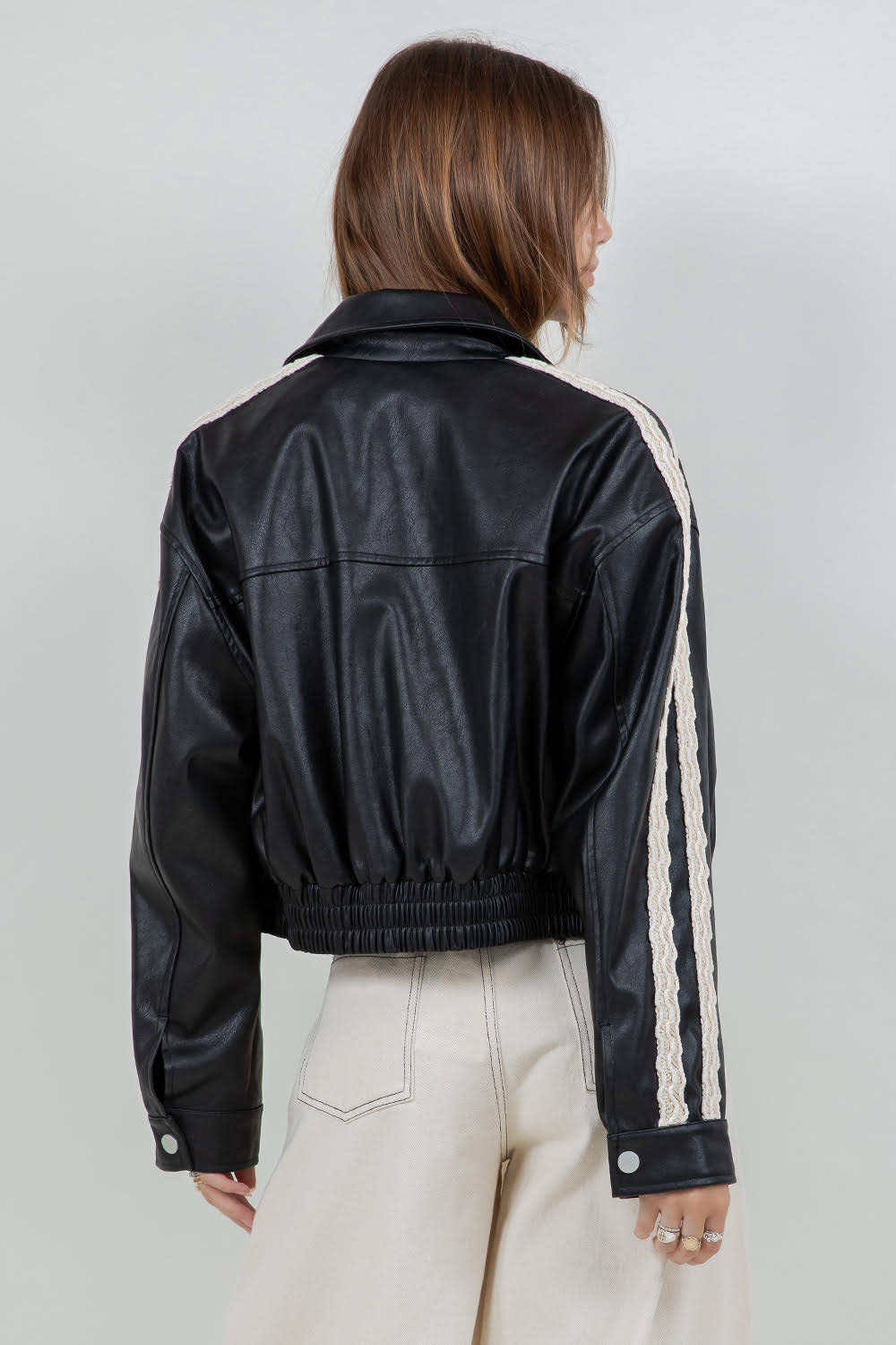 - The Lace Trim Leather Jacket is a bold, modern take on the classic bomber. Crafted in black PU faux leather, it features long sleeves, contrast trim, and subtle eyelet stitching for added texture and edge. With its structured silhouette and attention to detail, this jacket delivers a statement-making finish to any outfit—perfect for layering over casual or elevated looks.