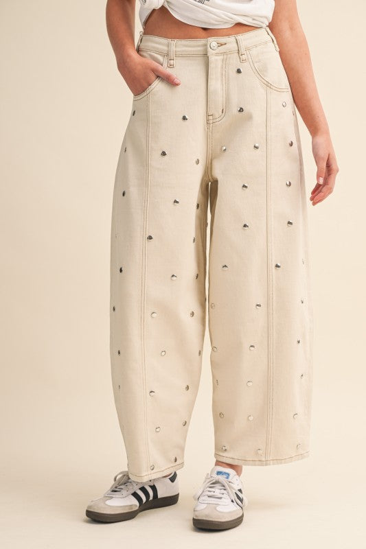 Studded Barrel Denim Pants- Cream