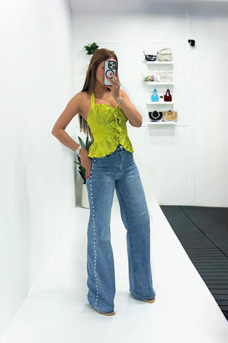 Embedded Pearl Wide Leg Denim Pant