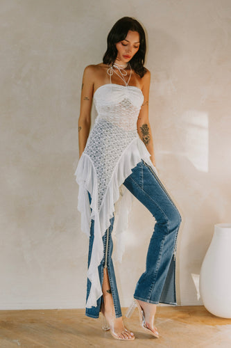 Lace Asymmetrical Ruffle Top- White