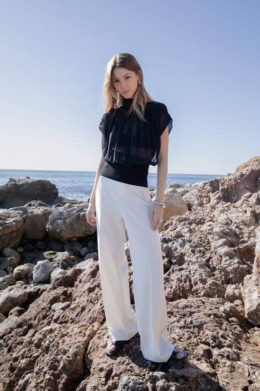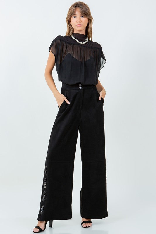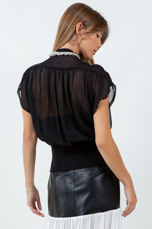 Contrasted Sleeveless Button Down Top with Removable Tie - Black/Pink